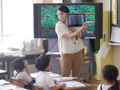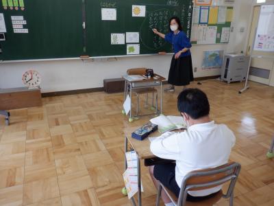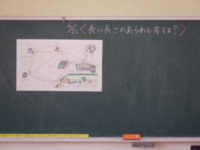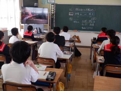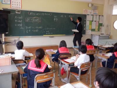 3年生は、算数で時間や長さの学習をしている様子です。姿勢よく話を聞き、学習に集中していました。