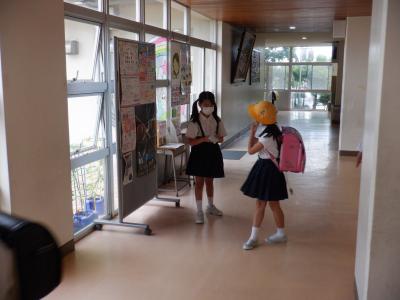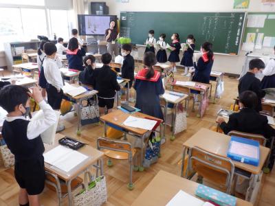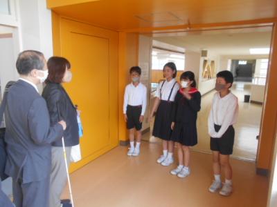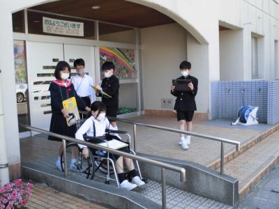 一学期の間、計画委員会の5,6年生が、月曜日と金曜日の朝、校門の側や児童玄関前のろうかで、
