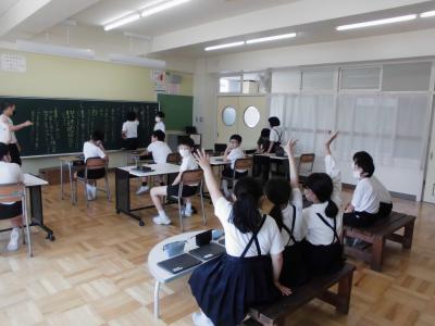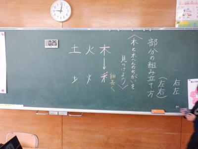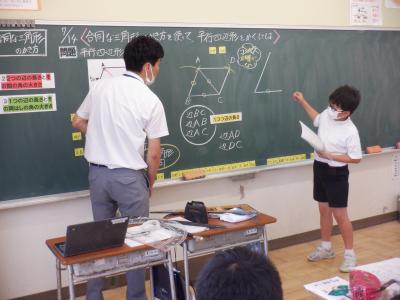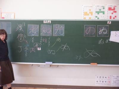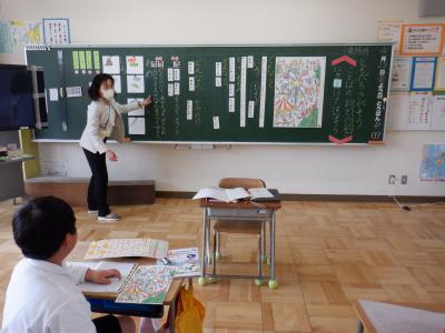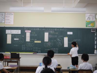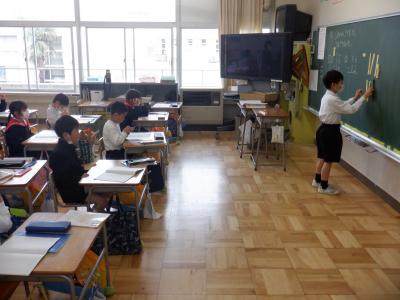 自分の考えた書き方を前に出て発表し、全体で考え方を整理しまとめているクラス。