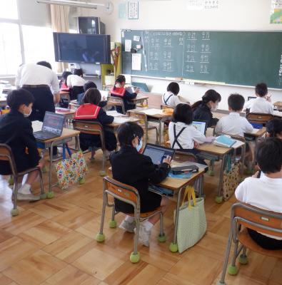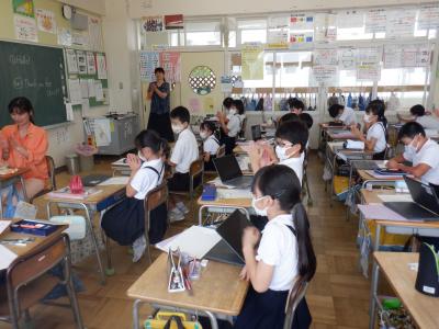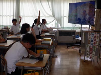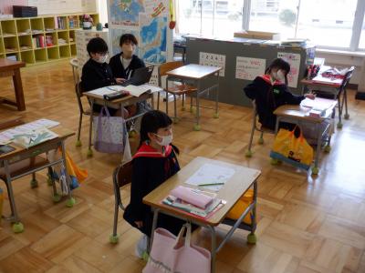 始業式は、全校を代表して6年生が体育館に集まり、2~5年生は各教室からリモートで参加しました。