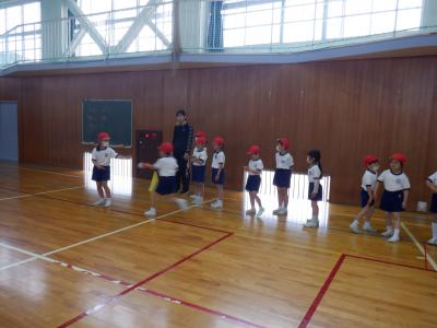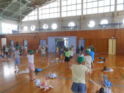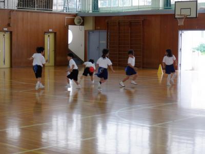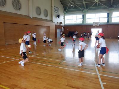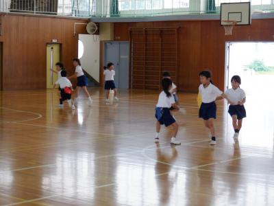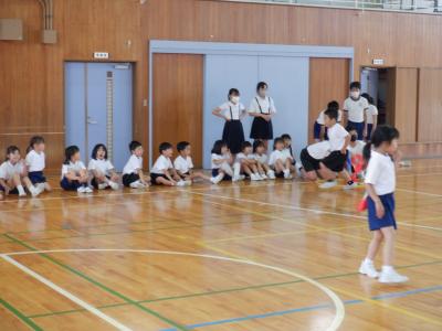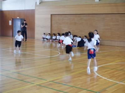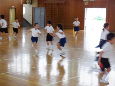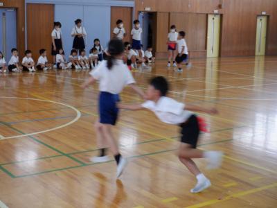 1年生は、相手クラスのしっぽを取るために、広い体育館を元気に走り回っていました。