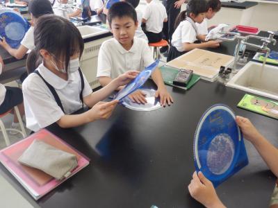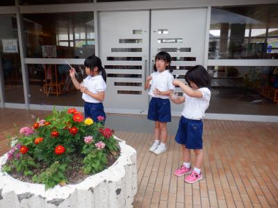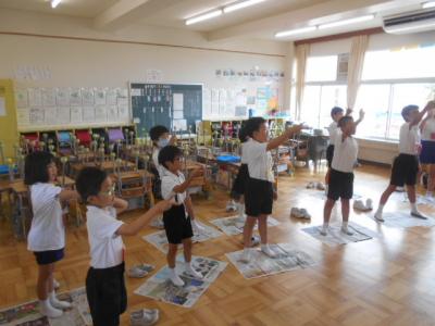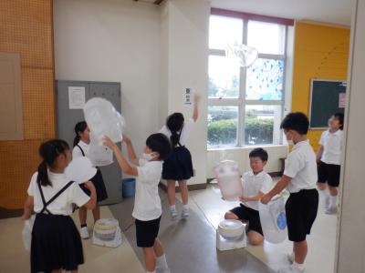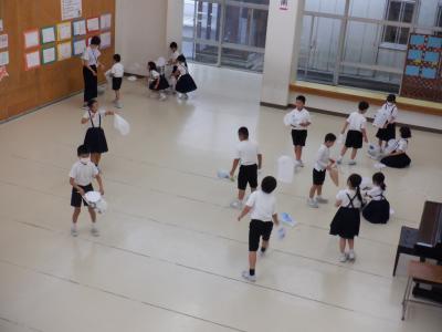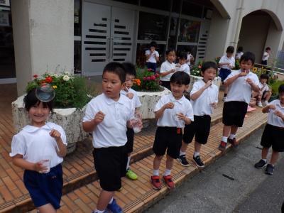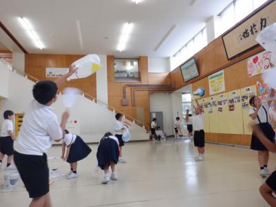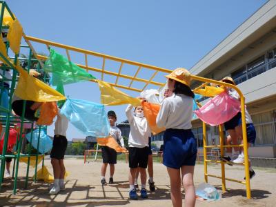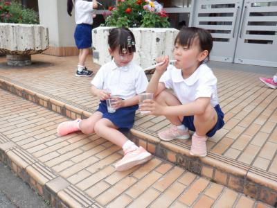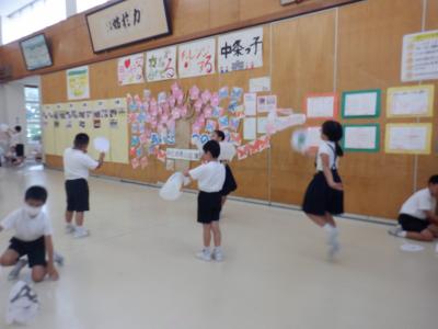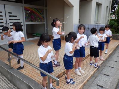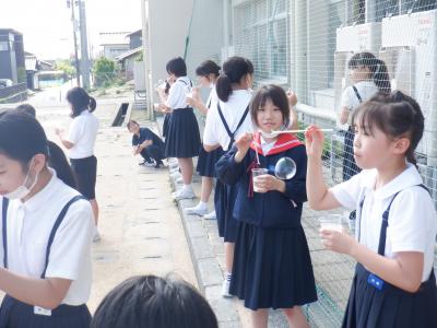 1年生は、生活科「なつと なかよし」の学習として、シャボン玉遊びを行っています。