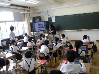 自分で書き方を考え、どんな方法で書いたか友だちと意見交換をした後、全体で学んでいるクラス。