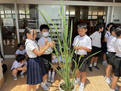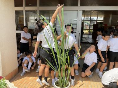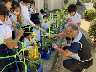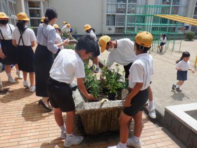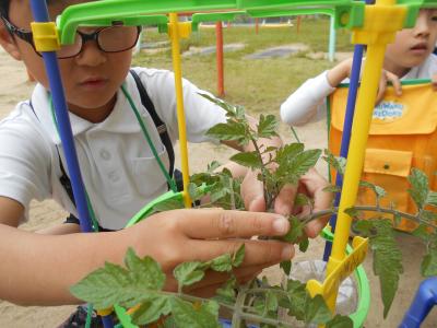 朝、登校すると、ミニトマトの様子を見に行って、水やりをしている2年生が何人もいます。