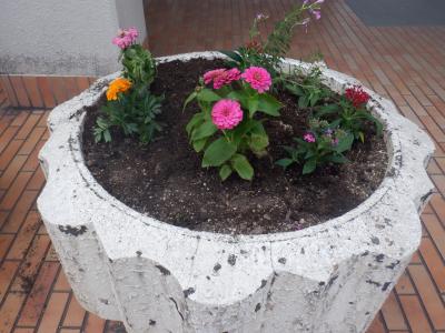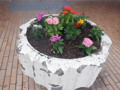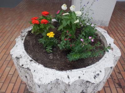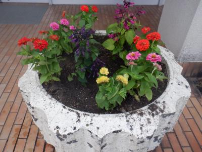 校門を通るとすぐ左手にある花壇の花たちは、今がさかりとばかりに咲いています。
