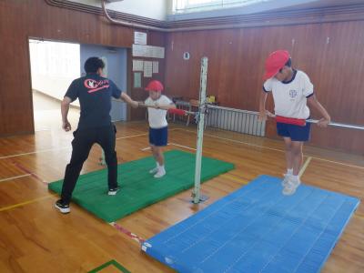 4月24日(月)の放課後、職員が体育館に鉄棒を設置しました。