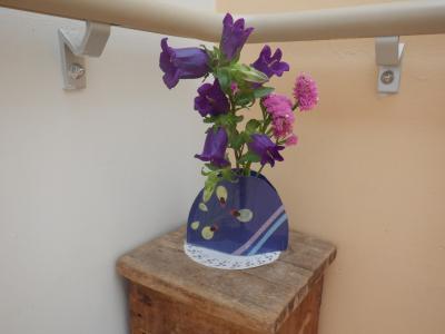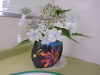7月に入り、ボランティアの中西さんが生けてくださるお花も花瓶のカバーも、
