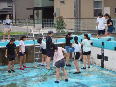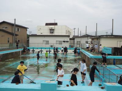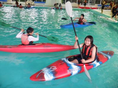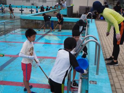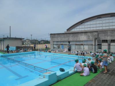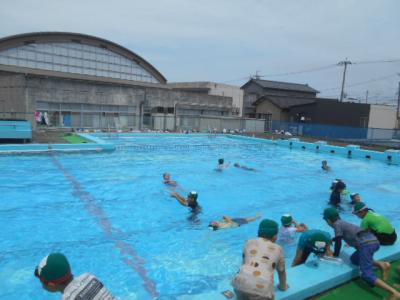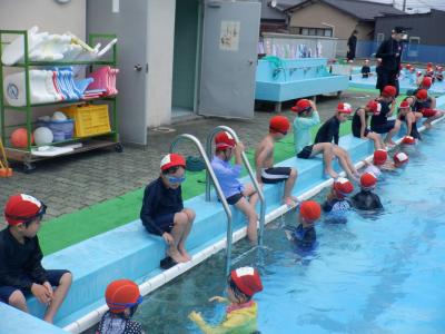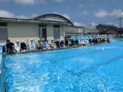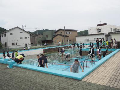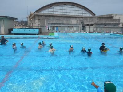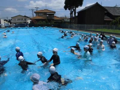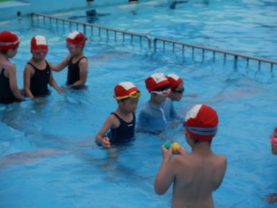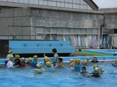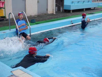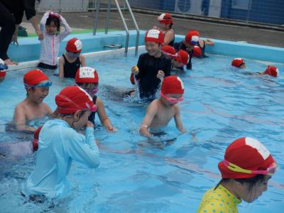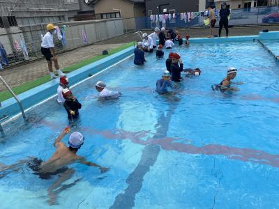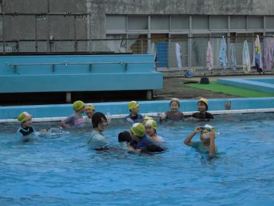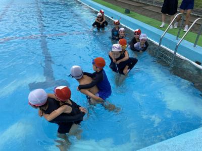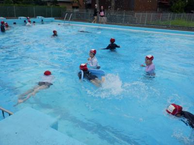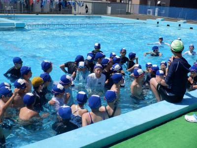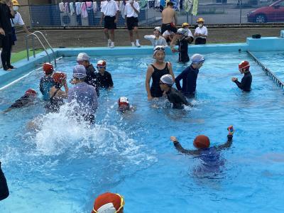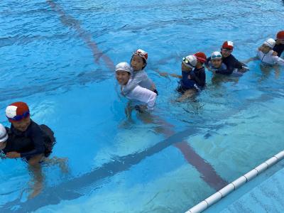 プールの中では、6年生は1年生をにおんぶして深い方のプールの中を歩いたり、