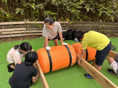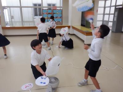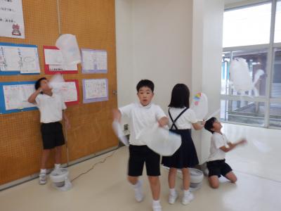 3年生が、プレイルームでポリ袋にむかって一生懸命うちわをあおいでいます。