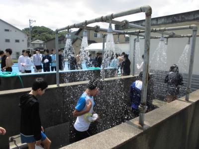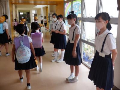 シャワーを浴びるところから、6年生は1年生と手をつなぐなど、お兄さん・お姉さんぶりを発揮。