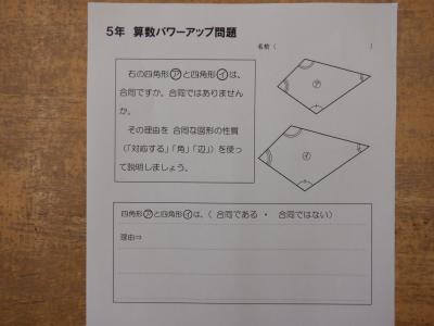 全校共通の取組として、定期的に朝学習で「パワーアップ問題」に取り組んでいます。