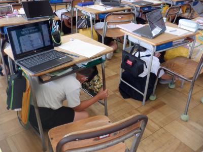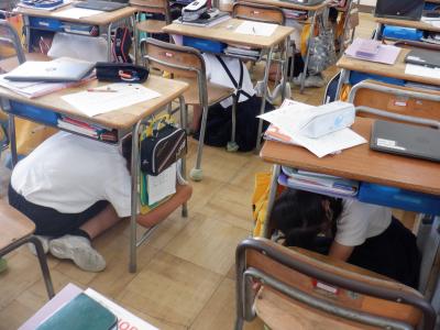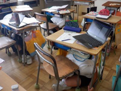 11:00に訓練開始。教室で授業をしていた子どもたちは、自分の机の下にかくれ、