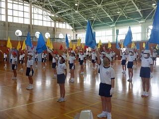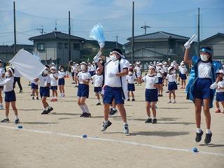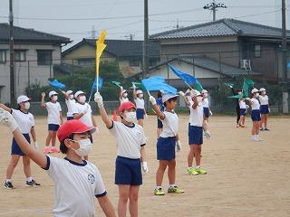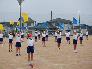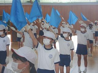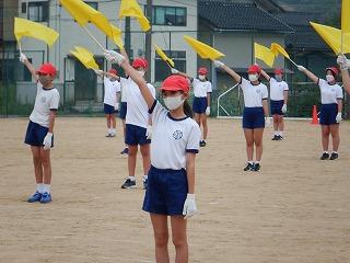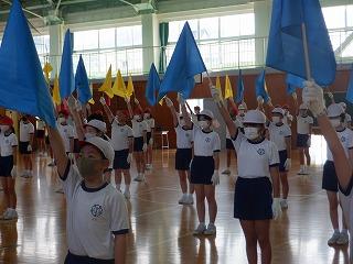 9月12日(月)5・6年生が、初めて合同で団体演技練習をしていました。今年の演技は、コロナ感染対策として接触を避けた演技をと、大きなフラッグを使って演技します。子ども達は、クラス別に色分けされたフラッグを使って、そろえた演技をしようと頑張っていました。