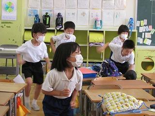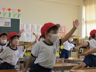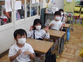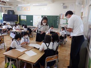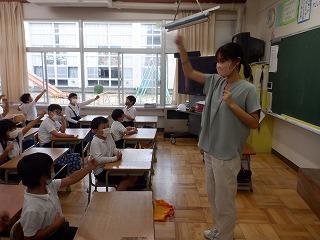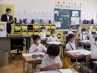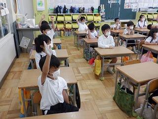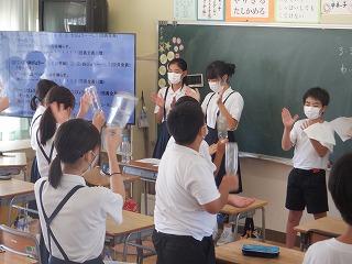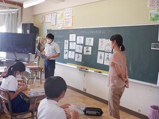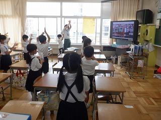 9月27日(火)1年2組の子ども達が、ALTと一緒に楽しく英語を使って活動していました。ALTのジェスチャーに合わせて素直に反応しながら、英語に親しんでいました。