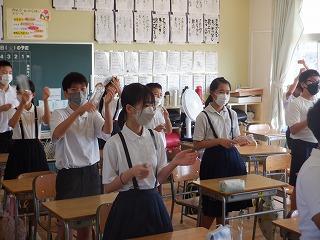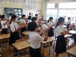 9月26日(月)3限目、全体練習に引き続き、応援合戦の練習を行いました。今年もコロナ対策のため声を出すのは応援団のみですが、運動会スローガンの通り「心を1つに」して赤白どちらのチームも力強い応援をしていました。本番でも、チームの優勝目指してがんばって応援したいですね。