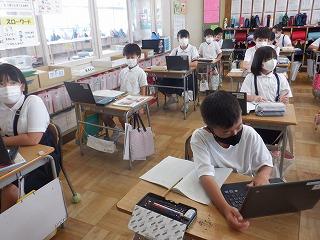 9月13日(火)3年1組の算数の時間では、かけ算の筆算について考えていました。子ども達は、自分の考えをクロームブックに記録し、図や式を基に説明し合っていました。