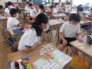 9月13日(火)5年1組の英語の学習では、canを使ってお互いにできることを紹介する練習をしていました。紹介するときに必要な言葉を覚えるために、ALTと何度も発音したり、友達とカードを取りながら確認して、楽しく学び合っていました。