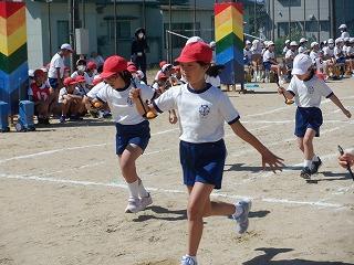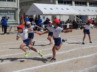 9月29日(木)の運動会では、低学年と高学年のリレーが行われました。各クラスから選ばれた選手たちが、心を1つにしてチームのバトンをつなぎ、しっかりとゴールできました。