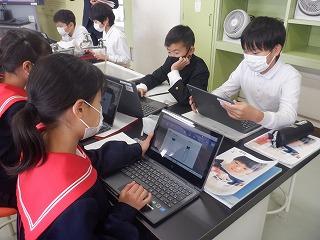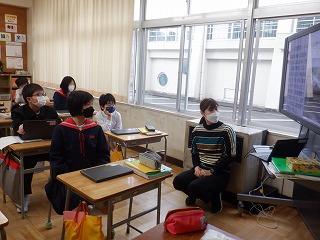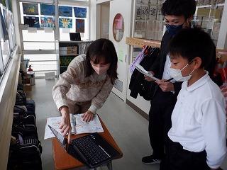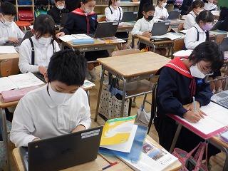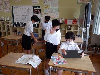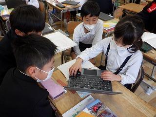 11月17日(木)5年2組の子ども達が、クロームブックの地図を使って、自宅までの道のりを伝える学習をしていました。子ども達は、学んだセンテンスを上手に使って説明できるようにと、ペアになって練習したり画面を見ながら練習したりしていました。