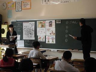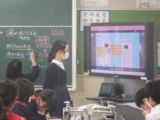 11月22日(火)町の栄養教諭を講師にお迎えして、1年生が食育の学習をしました。1組さんも2組さんも、食べ物の持つ3つの働きについて知り、健康な体をつくるには好き嫌いせずに食べることが大事だと気付いていました。
