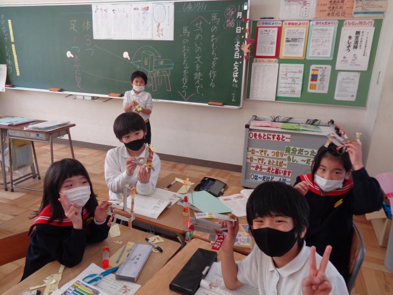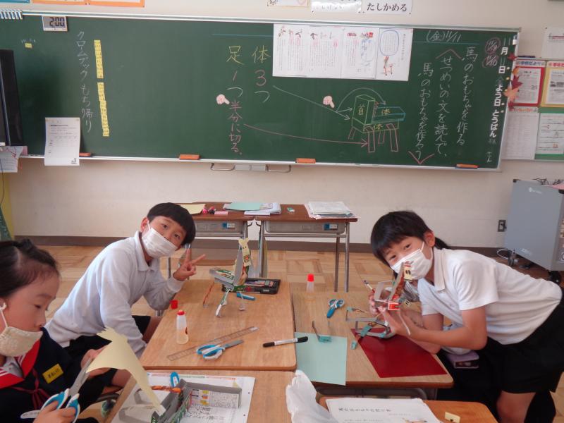 11月11日(金)4限目と11月14日(月)1限目に、2年2組の子どもたちが、国語科「馬のおもちゃの作り方」の学習で、馬のおもちゃを作る活動をしました。教科書の文章を読んで、「まず」「つぎに」「それから」の順に従って、友達と教え合いながら、馬のおもちゃを完成させることができました。今度は、学んだ説明のしかたの工夫を生かして、自分の作ったおもちゃの作り方の説明書を書きます。どんなおもちゃの説明書ができるか楽しみです。