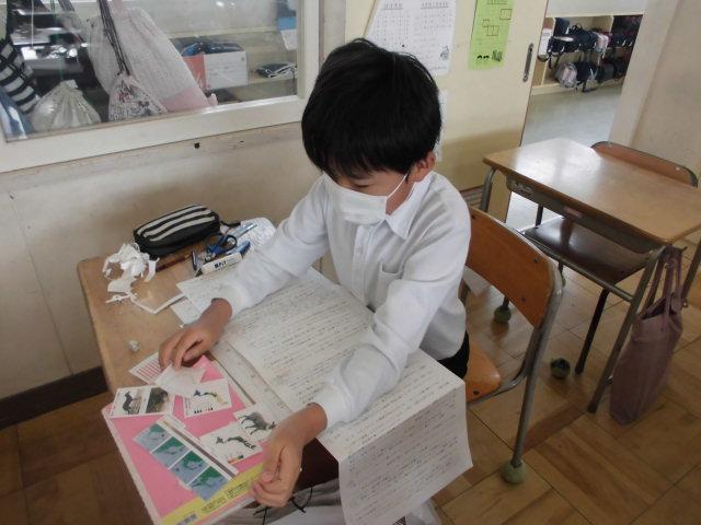 5年生の国語では、「固有種が教えてくれること」という学習をしています。この学習では、筆者が図表やグラフ・写真を使った意図と効果を考え、要旨を捉えることを目標としているので、子ども達は、たくさんある資料の中から、筆者の主張を効果的に伝えている文や言葉に着目しながら考えていました。