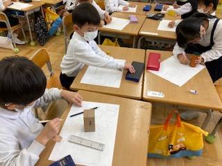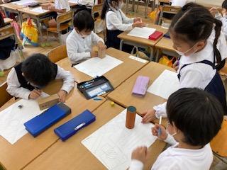 11月15日(火)1年1組の子ども達が、算数の時間に積み木を使って形の学習をしていました。積み木の側面の四角や三角・丸などの形を上手に写して、自分の思い描いたイメージの絵になるようにと、一生懸命に取り組んでいました。