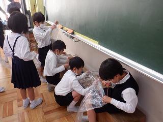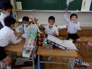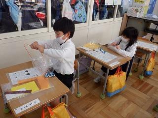 先週、1年1組の子ども達が、風に揺れる飾りを作っていました。風に揺れると楽しかったりきれいだったりする飾りを考え、はさみやセロハンテープなどを上手に使いながら、イメージ通りに作ろうと頑張っていました。
