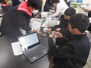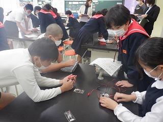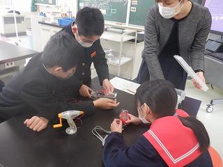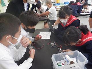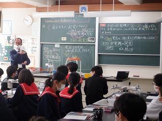 11月21日(月)県教員総合研修センターの指導主事をお迎えして、6年2組で理科の研究授業を行いました。子ども達は、手回し発電機で起こした電気をコンデンサーに蓄電し、オルゴールやモーター・豆電球につないで、貯めた電気が音や運動・光に変えて利用できることを実験で確かめていました。