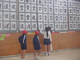 11月21日(月)22日(火)の2日間、4~6年生の河北郡市小学校の代表児童の書写作品が本校に展示されています。本校代表児童の作品も、丁寧に仕上げた素晴らしい作品ばかりでした。子ども達は、プレールームに展示された各校代表の作品をしげしげと見つめ、作品のよさを味わっていました。
