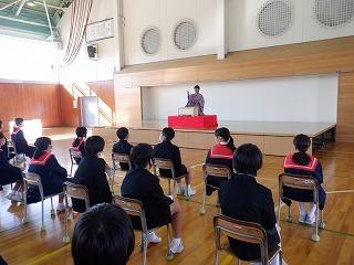 11月21日(月)吉本興業所属の落語家月亭方気さんをお迎えして、6年生が「おきらくご」を体験しました。子ども達は、月亭方気さんの軽快な話術に引き込まれ、落語の歴史について学んだり落語のよさを知ったりしながら、2時間たっぷりと楽しみました。