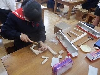 12月2日(金)4年2組の子ども達が、図工の時間に金槌とのこぎりを使って作品作りをしていました。4年生になって、初めてのこぎりを扱う題材なので、のこぎりを使う時には、2人組でしっかりと押さえながら安全に気を付けて活動していました。