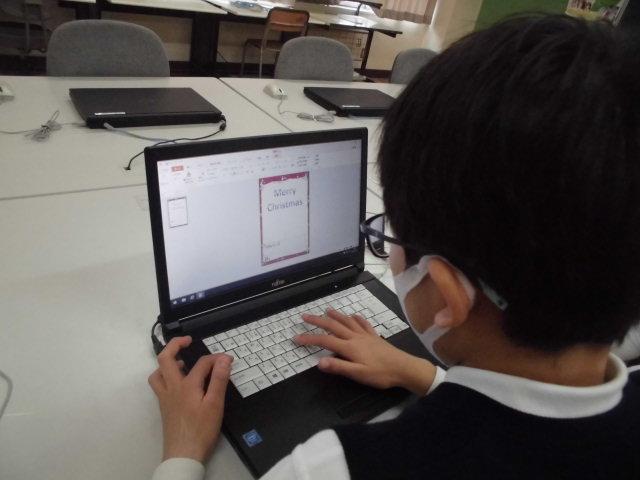 12月5日(月)5年生が、パソコンサポートの先生と一緒にクリスマスカードを作成しました。画像の挿入の仕方や文字のデザインの変え方などを教えていただき、子ども達は、「どんなクリスマスカードにしようか」「どんな画像を入れようか」「どんなメッセージにしようか」など、一人一人自分のイメージしたカードを作成しようと集中して取り組んでいました。