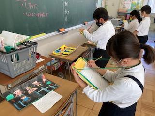 5年生の国語では、物語「たずねびと」の学習をしています。この物語では、登場人物の心情の変化や表現の効果に着目しながら学習しています。この日の学習では、物語全体から自分が感じたこと(メッセージ)を交流し合い、自分の思いをまとめました。