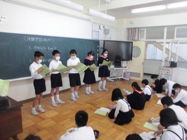 10月18日(火)今日は、5年生の体験学習の日。体験場所の銀河の里キゴ山に向かう前に、実行委員による出発式を行いました。昨年度から身に付けてきた「礼儀・感謝・考動力」を発揮する場としても頑張ろうと、みんなでめあてを確認していました。どの子も、やる気満々で、高学年としての力を高める体験学習になると期待できる出発式でした。