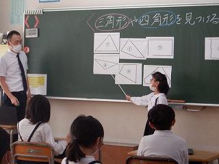 10月14日(金)町教育委員会の指導主事をお迎えして、2年1組で算数科の研究授業を行いました。この日は、三角形・四角形・どちらでもない形の3種類に弁別する学習でしたが、子ども達は、クロームブックを操作しながら自分の考えをもち、発表していました。