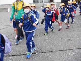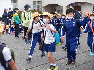 玄関では、全員元気に手を振って歩きだしました。1年生も2年生も、頑張って最後まで歩き、一緒に仲良く遊んで楽しい思い出にしてきてくださいね。