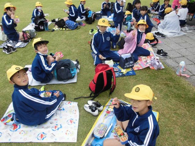 途中雨が降るというアクシデントもありましたが、仲良くお弁当とおやつを食べました。