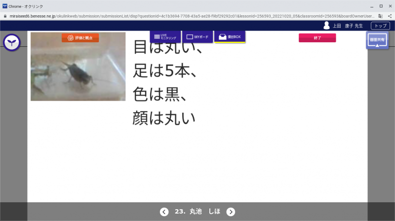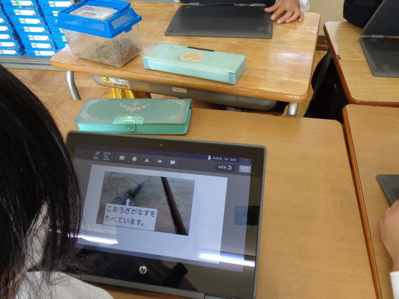 これからのお世話については、教科書や図鑑やインターネットで調べたり、実際に虫を触りながら自分の体験を説明したりしながら学び合っていました。