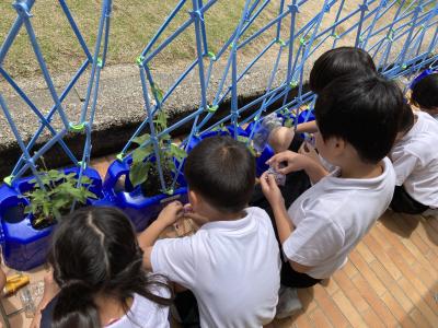 支柱を立てたり、追肥をしたりと、お世話を頑張る1年生。