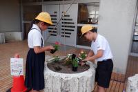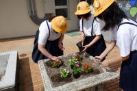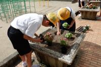 環境委員会は、児童玄関と小運動場にある花壇にベコニアと日日草の苗を植えました。