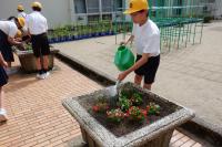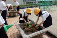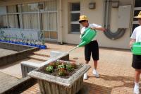 環境委員会の皆さん、花の苗がしっかり根付き、大きくなるよう、水やりをお願いします。