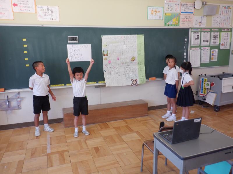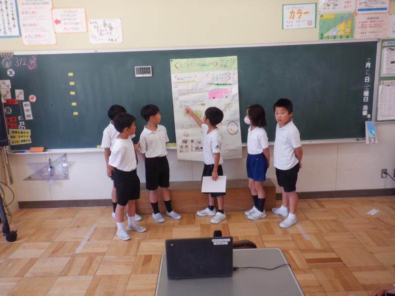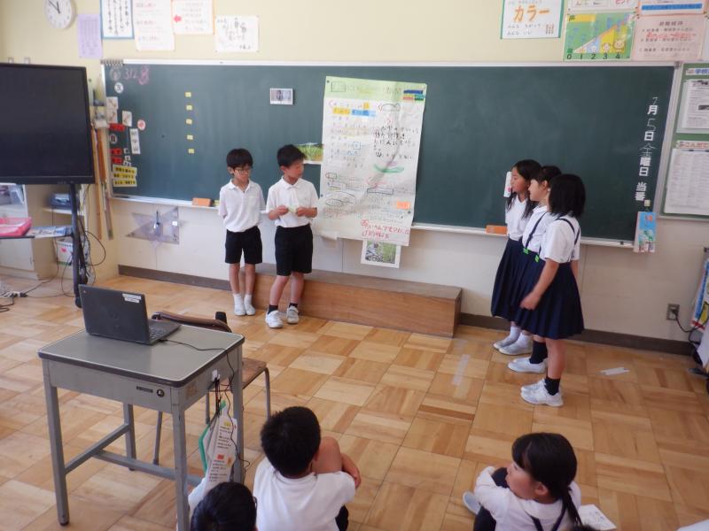 子供たちは,調べた事について写真を用いたり,聴き手をひきつけるためにクイズ形式にしたりするなど様々な工夫をして「まこも」のよさを伝えることができました。
