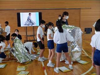 講話の後、アルミシートや段ボールべとの実演を体験しました。子ども達は、初めての体験に興味津々で活動していました。