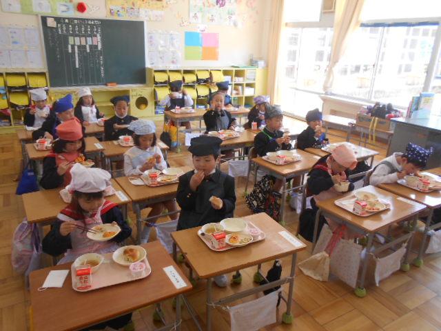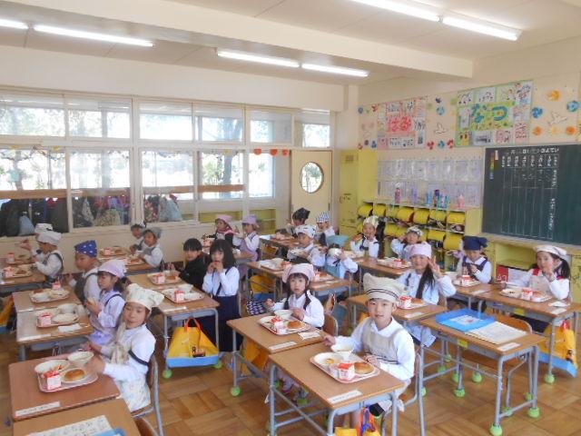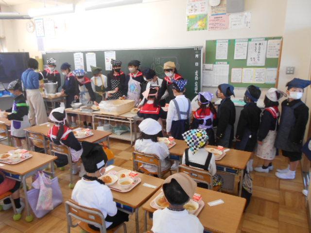 1年生は、6年生が準備をしているときから静かに待つことができ、きちんと順番に並んで給食を受け取ることができました。