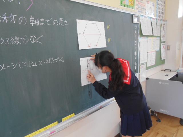 自分の考えを、相手に伝わるように、黒板に出てかきながら説明する姿。