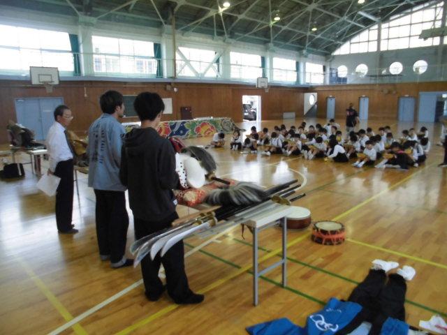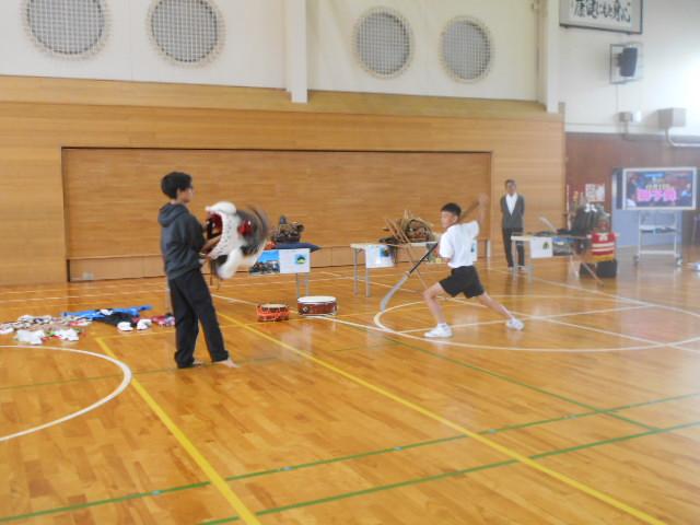 子供たちは,獅子舞の頭や棒振りの演技を間近で見て,迫力やかっこよさを感じていたようです。最後に,頭(かしら)や棒振りに使われる道具に触れたり、道具を使って体験をしたりしました。