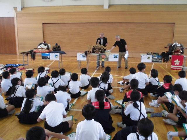 子供たちは,聞いたことを一生懸命にメモしていました。話を聞いた後は,高学年の児童が棒振りを披露してくれました。