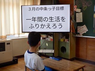 2月28日(火)朝学習の時間に、生徒指導担当から3月の中条っ子目標の取組について話がありました。今年度最後の取組となる今月の目標は、「1年間の生活をふりかえろう」です。リモートでの説明でしたが、子ども達は、スライドを見ながら1年間を振り返り、取組の目的や方法をしっかりと聞いていました。