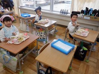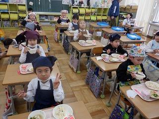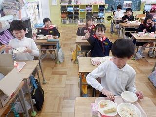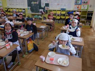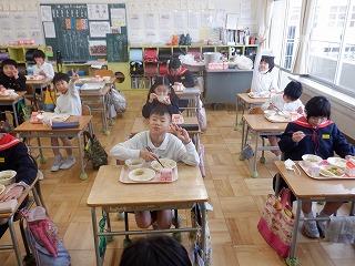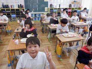 明日の雛祭りを前に、今日の給食は「ちらし寿司・ちくわの磯部揚げ・菜の花のごま和え・あさりのすまし汁・雛祭りケーキ」の『雛祭り献立』でした。調理師・調理員さん達が、子ども達の成長を願い、心をこめて作った給食を全校児童でおいしくいただきました。